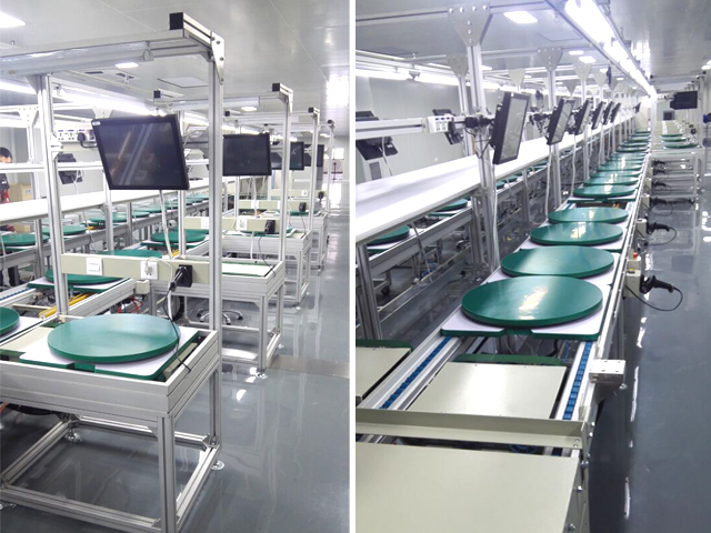 平面循環組裝線動力部分:定速10M/min。 線體部分:W=646mm。 電源部分:每工位配三位排插,限用小于2KW電路工具及檢測儀器及顯示器用。電控阻擋器氣控阻擋器自動頂升平移機: 過渡平移機: 工裝板:(雙層) 三層投料小車 移出測試工作臺 電氣部分