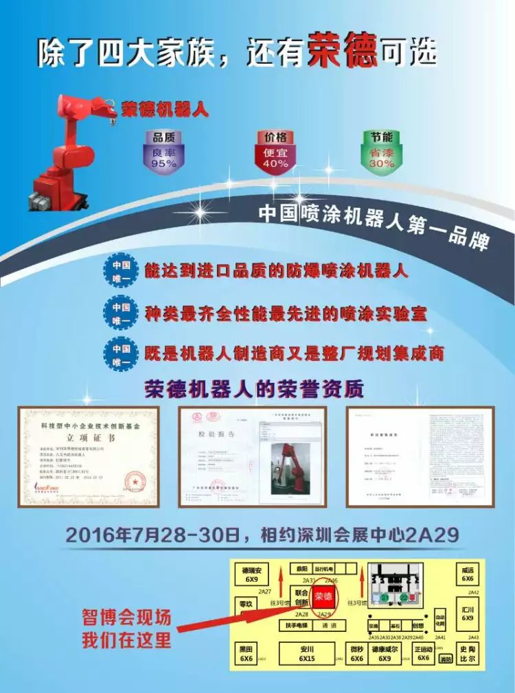 雖然在南海問題愈演愈烈的當下,支持民族品牌已是大勢所趨,但榮德機器人不打感情牌,我們打技術牌、實力牌,如果您有興趣參觀過榮德的展位2A29,也許您會發現:除了四大家族,榮德噴涂機器人也是一個非常不錯的選擇!多謝指教!