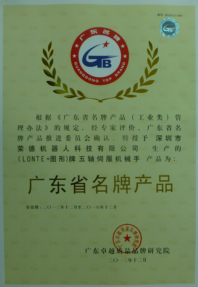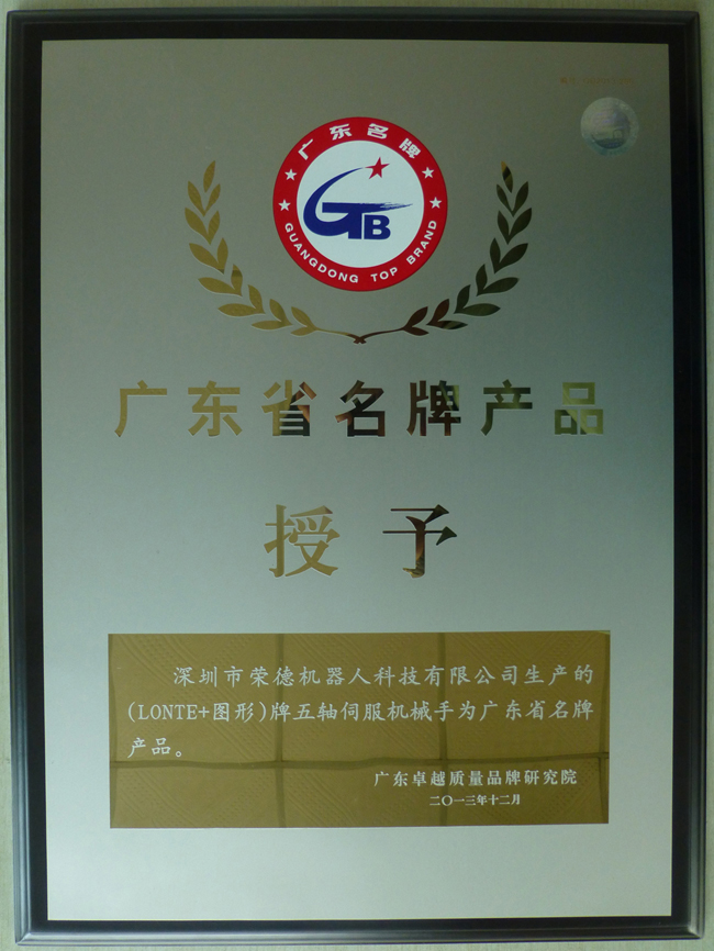 廣東省名牌產品申報可以說是相當嚴格,體現了該榮譽的嚴肅性、公正性。這也充分證明了深圳市榮德機器人科技有限公司的綜合實力以及客戶對榮德公司的滿意程度。