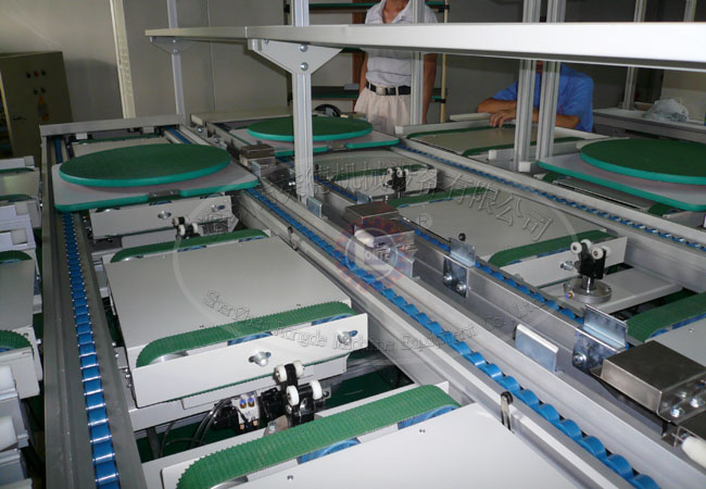 5.輸送鏈基本規格:按照工裝托盤尺寸設計。輸送托盤參考尺寸:L280*W280*T14。輸送托盤輸送速度:主輸送鏈段≥14m/min(可變速),返回輸送鏈段≥21m/min(可變速)。