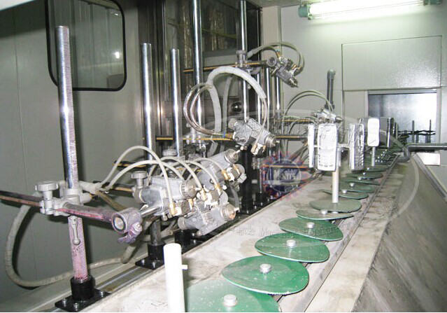 Ω靜電自動噴涂設備,是將輸送軌彎曲成Ω形,工件圍繞圓盤式靜電噴槍周圍通過,并在噴涂過程中自轉,圓盤噴槍上下移動進行自動噴涂。由于工件圍繞圓盤噴槍通過,工件相對噴槍的時間較長,允許輸送鏈速度較高,故生產效率較高。圓盤噴槍上下移動行程及速度,可依據工件外形來調節,提高涂膜質量。